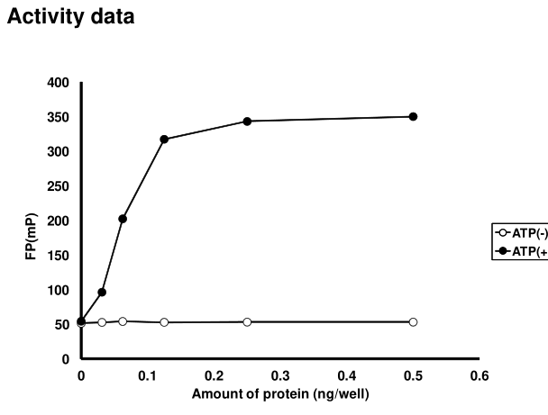 | Bio-activity : | The activity was determined by IMAP™ assay. The enzyme was incubated with fluorescein labeled peptide and phosphorylation was detected by IMAP™ technology (fluorescence polarization). |
