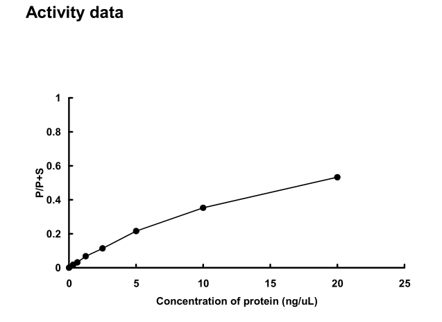 | Bio-activity : | The activity was measured by off-chip mobility shift assay. The enzyme was incubated with fluorecence-labeled substrate and Mg(or Mn)/ATP. The phosphorylated and unphosphorylated substrates were separated and detected by LabChip™3000. |