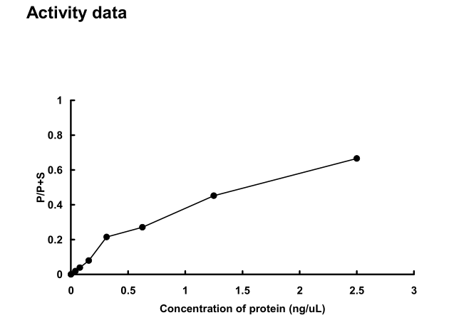 | Bio-activity : | The activity was measured by off-chip mobility shift assay. The enzyme was incubated with fluorecence-labeled substrate and Mg(or Mn)/ATP. The phosphorylated and unphosphorylated substrates were separated and detected by LabChip™3000. |