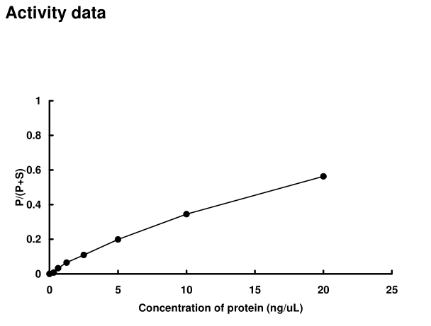 | Bio-activity : | The activity was measured by off-chip mobility shift assay(MSA). The enzyme was incubated with fluorecence-labeled substrate and Mg(or Mn)/ATP. The phosphorylated and unphosphorylated substrates were separated and detected by MSA device. |