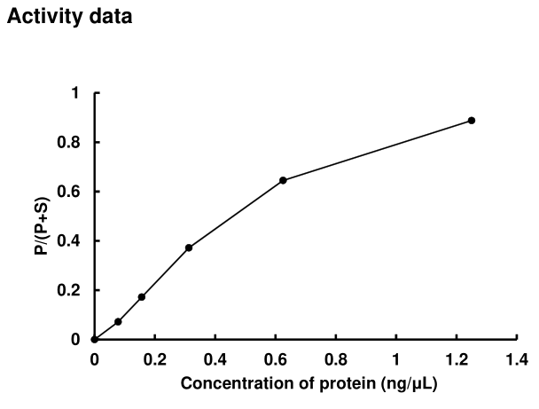 | Bio-activity : | The activity was measured by off-chip mobility shift assay(MSA). The enzyme was incubated with fluorecence-labeled substrate and Mg(or Mn)/ATP. The phosphorylated and unphosphorylated substrates were separated and detected by MSA device. |