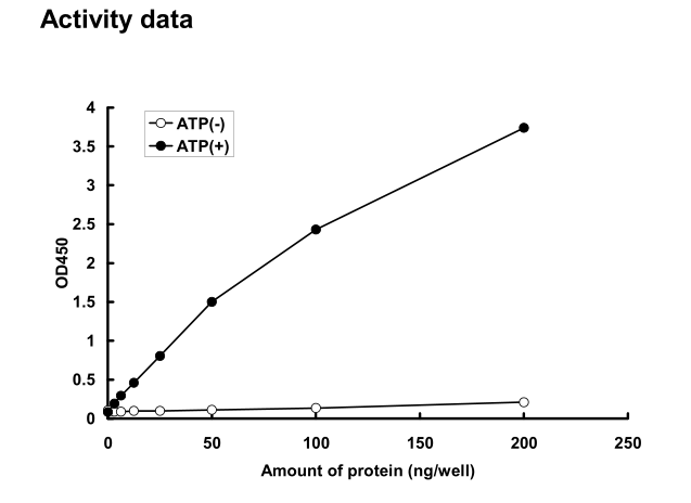 | Bio-activity : | The activity was determined by ELISA. The enzyme was incubated with GST-fused substrate protein, and after stopping kinase reaction by EDTA, the reaction solution was transferred into glutathione- coated plate. Phosphorylation was detected by anti-phospho antibody and HRP-labeled anti-rabbit IgG. |