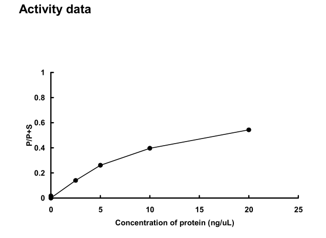 | Bio-activity : | The activity was measured by off-chip mobility shift assay. The enzyme was incubated with fluorecence-labeled substrate and Mg(or Mn)/ATP. The phosphorylated and unphosphorylated substrates were separated and detected by LabChip™3000. |