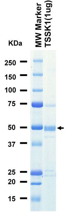 | Product Overview : | Full-length human TSSK1 [1-367(end) amino acids of accession number NP_114417.1] was expressed as N-terminal GST-fusion protein using baculovirus expression system. GST-TSSK1 was purified by using glutathione sepharose chromatography. GST-TSSK1 was cleaved by PreScission protease and GST-free TSSK1 (42 kDa) was collected as flow-through fraction from glutathione sepharose chromatography. |