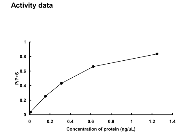 | Bio-activity : | The activity was measured by off-chip mobility shift assay. The enzyme was incubated with fluorecence-labeled substrate and Mg(or Mn)/ATP. The phosphorylated and unphosphorylated substrates were separated and detected by LabChip™3000. |