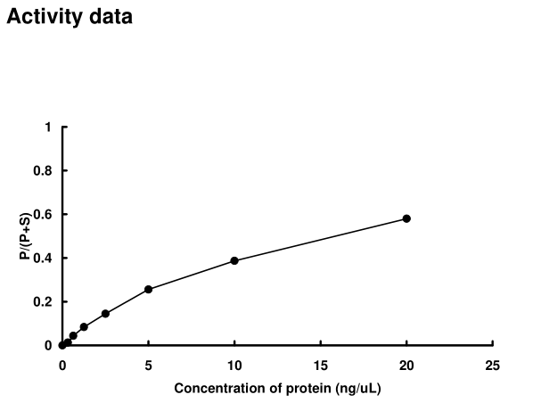 | Bio-activity : | The activity was measured by off-chip mobility shift assay. The enzyme was incubated with fluorecence-labeled substrate and Mg(or Mn)/ATP. The phosphorylated and unphosphorylated substrates were separated and detected by LabChip™3000. |