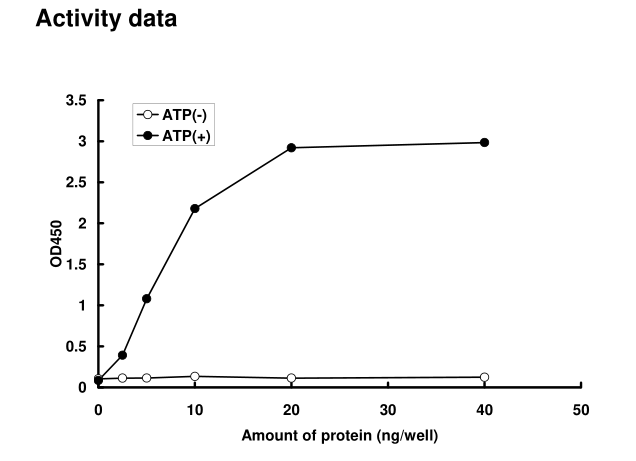 | Bio-activity : | The activity was determined by ELISA. The enzyme was incubated with biotinylated substrate protein, and after stopping kinase reaction by EDTA, the reaction solution was transferred into streptavidin- coated plate. Phosphorylation was detected by anti-phospho antibody and HRP-labeled anti-rabbit IgG. |