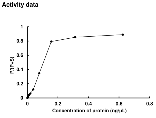 | Bio-activity : | The activity was measured by off-chip mobility shift assay(MSA). The enzyme was incubated with fluorecence-labeled substrate and Mn/ATP. The phosphorylated and unphosphorylated substrates were separated and detected by MSA device. |