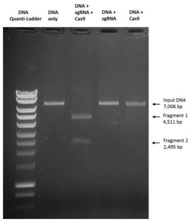 | Bio-activity : | In vitro digestion of a DNA fragment with the recombinant S.pyrogene Cas9 nuclease. The input DNA is XmnI-linearized vector was cleaved by with a synthetic sgRNA. |