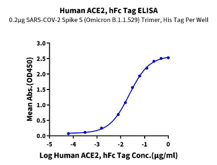 | Bio-activity : | Immobilized SARS-COV-2 Spike S (Omicron B.1.1.529) Trimer, His Tag at 2μg/ml (100μl/well) on the plate. Dose response curve for Human ACE2, hFc Tag with the EC50 of 22.9ng/ml determined by ELISA. |