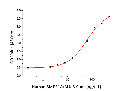 | Bio-activity : | 1.Measured by its binding ability in a functional ELISA.Immobilized Human ACVR2B at 1 μg/mL (100 μL/well) can bind Human BMPRIA with a linear range of 0.5-62.5 ng/mL. 2.Measured by its binding ability in a functional ELISA.Immobilized Human CD105 at 1 μg/mL (100 μL/well) can bind Human ACVR2B with a linear range of 0.49-43.03 ng/mL. |
