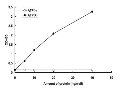 | Bio-activity : | The activity was determined by ELISA. The enzyme was incubated with biotinylated substrate protein, and after stopping kinase reaction by EDTA, the reaction solution was transferred into streptavidin- coated plate. Phosphorylation was detected by anti-phospho antibody and HRP-labeled anti-rabbit IgG. Substrate: Porcine tublin. ATP: 100 uM. |
