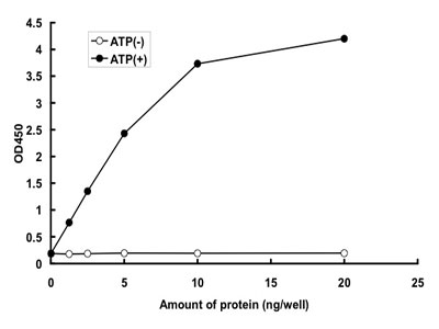 | Bio-activity : | The activity was determined by ELISA. The enzyme was incubated with biotinylated substrate protein, and after stopping kinase reaction by EDTA, the reaction solution was transferred into streptavidin- coated plate. Phosphorylation was detected by anti-phospho antibody and HRP-labeled anti-rabbit IgG. Substrate: Porcine tublin. ATP: 100 uM. |