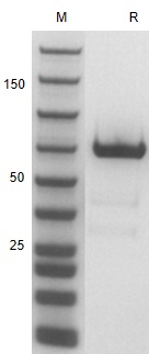 | Molecular Mass : | This protein carries a polyhistidine tag at the C-terminusThe protein has a calculated MW of 54.5 kDa. The protein migrates as 60-66 kDa under reducing (R) condition (SDS-PAGE) due to glycosylation. |