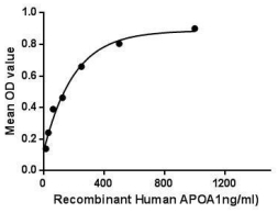 Apolipoprotein A1 (APOA1) is the major protein component of HDL particles in plasma. It is a cofactor for lecithin cholesterolacyltransferase (LCAT) which is responsible for the formation of most plasma cholesteryl esters. ApoA1 was also isolated as a prostacyclin (PGI2) stabilizing factor, and thus may have an anticlotting effect. ApoA1 is often used as a biomarker for prediction of cardiovascular diseases. Besides, Haptoglobin (Hpt) has been identified as an interactor of APOA1, thus a binding ELISA assay was conducted to detect the interaction of recombinant human APOA1 and recombinant human Hpt. Briefly, APOA1 were diluted serially in PBS, with 0.01% BSA (pH 7.4). Duplicate samples of 100uL were then transferred to Hpt-coated microtiter wells and incubated for 2h at 37°C. Wells were washed with PBST and incubated for 1h with anti-APOA1 pAb, then aspirated and washed 3 times. After incubation with HRP labelled secondary antibody, wells were aspirated and washed 3 times. With the addition of substrate solution, wells were incubated 15-25 minutes at 37°C. Finally, add 50µL stop solution to the wells and read at 450nm immediately. The binding activity of APOA1 and Hpt was shown, and this effect was in a dose dependent manner. |