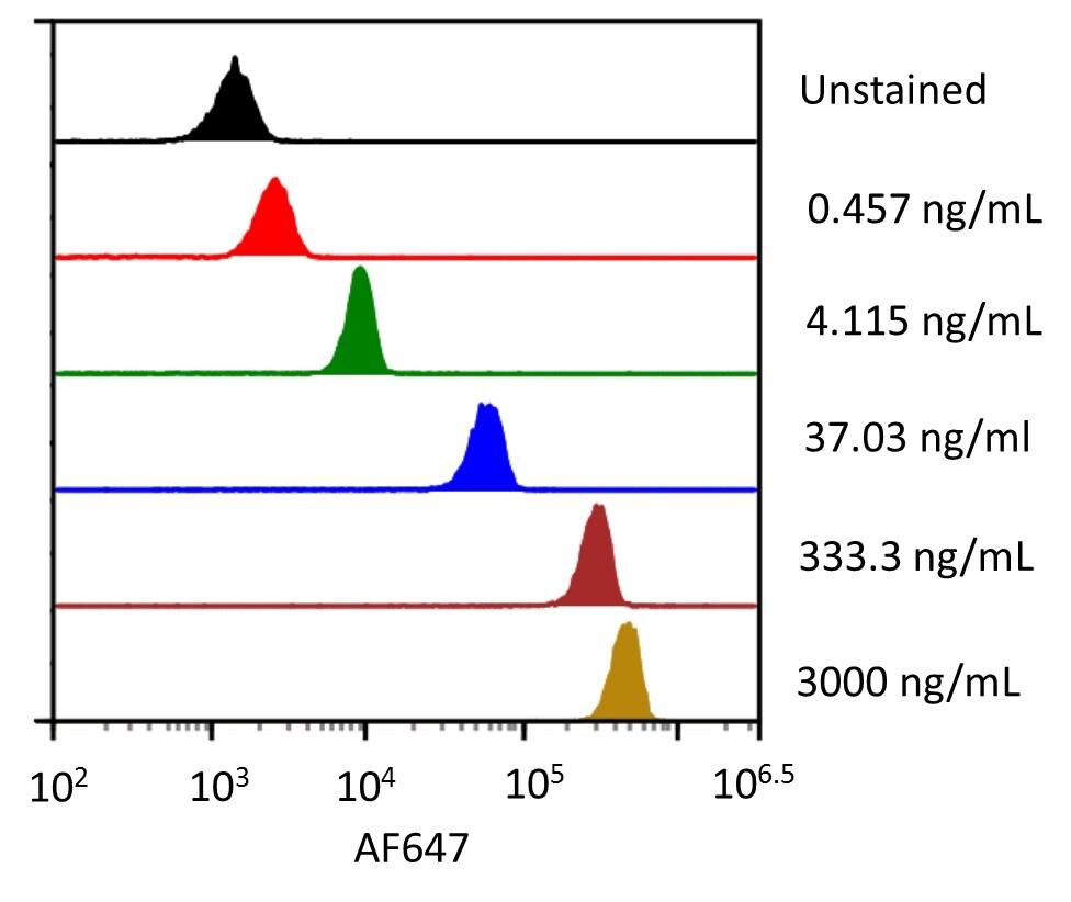 | Bio-activity : | Measured by flow cytometry for its ability to bind anti-human EMMPRIN/CD147 Monoclonal Antibody conjugated beads. The concentration of Recombinant Human EMMPRIN/CD147 Fc Chimera Alexa Fluor® 647 that produces 50% of the binding response is 0.25-5.00 ng/mL. |