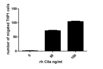 Complement Component 5a (C5a) is a component of the complement system which plays a key role in promoting migration and adherence of neutrophils and monocytes to vessel walls. C5a has been proven to be able to induce chemotactic migration of THP-1 cells. Therefore, chemotaxis assay used 24-well microchemotaxis system was undertaken to detect the chemotactic effect of C5a on the human monocytic cell line THP-1. Briefly, THP-1 cells were seeded into the upper chambers (100µL cell suspension, 10^6 cells/mL in RPMI 1640 with 0.5% FBS) and C5a (50ng/mL and 100ng/mL diluted separately in serum free RPMI 1640) was added in lower chamber with a polycarbonate filter (8µm pore size) used to separate the two compartments. After incubation at 37°C with 5% CO2 for 2h, the filter was removed, then cells in low chamber were observed by inverted microscope at low magnification (×100) and the number of migrated cells were counted at high magnification (×400) randomly (five fields for each filter). Result: C5a is able to induce migration of THP-1 cells. The migrated THP-1 cells in low chamber at low magnification (×100) were shown. |