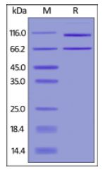 This protein carries a polyhistidine tag at the C-terminus. The mature form of Complement C5 is a disulfide-linked heterodimer composed of proteolytically cleaved α and β chain. Each α and β chain has a calculated MW of 73.9 kDa (β chain) and 114.3 kDa (α chain). The protein migrates as 80 kDa (β chain) and 110 kDa (α chain) under reducing (R) condition (SDS-PAGE) due to glycosylation. |