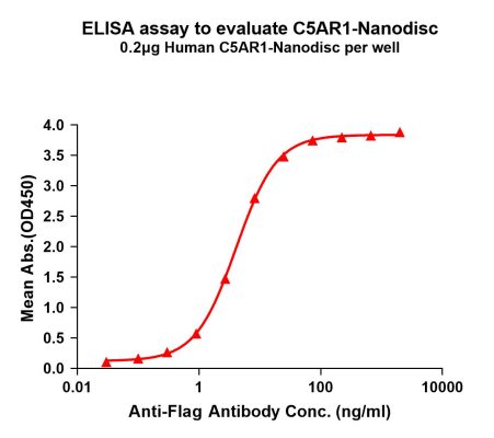 Elisa plates were pre-coated with Flag Tag C5AR1-Nanodisc (0.2μg/per well). Serial diluted anti-Flag monoclonal antibody solutions were added, washed, and incubated with secondary antibody before Elisa reading. From above data, the EC50 for anti-Flag monoclonal antibody binding with C5AR1-Nanodisc is 4.088ng/ml. |