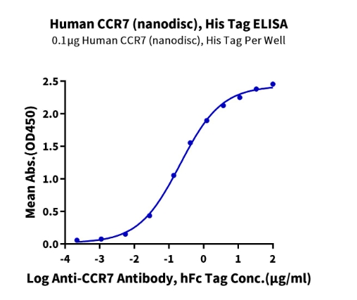 Bio-activity : | Immobilized Human CCR7 (Nanodisc), His Tag at 1μg/ml (100μl/well) on the plate. Dose response curve for Anti-CCR7 Antibody, hFc Tag with the EC50 of 0.21μg/ml determined by ELISA. |