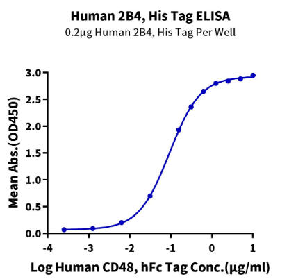 | Bio-activity : | Immobilized Human 2B4, His Tag at 2μg/ml (100μl/well) on the plate. Dose response curve for Human CD48, hFc Tag with the EC50 of 92.3ng/ml determined by ELISA. |