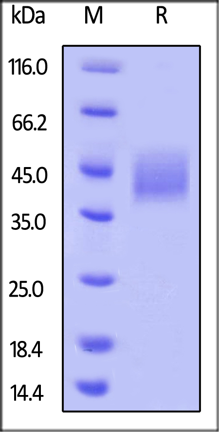 Molecular Mass : | This protein carries an Avi tag (Avitag™) at the C-terminus, followed by a polyhistidine tag.The protein has a calculated MW of 26.5 kDa. The protein migrates as 35-45 kDa under reducing (R) condition (SDS-PAGE) due to glycosylation. |