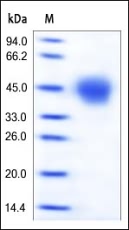 | Molecular Mass : | The protein has a calculated MW of 27.6 kDa. The protein migrates as 43-55 kDa under reducing (R) condition (SDS-PAGE) due to glycosylation. |