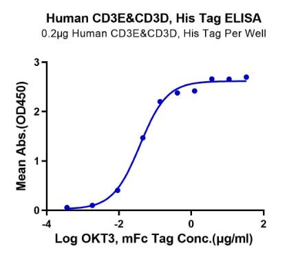 | Bio-activity : | Immobilized Human CD3E&CD3D at 2μg/ml (100μl/Well) on the plate. Dose response curve for OKT3, mFc Tag with the EC50 of 38ng/ml determined by ELISA. |