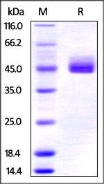 The heterodimer Human CD3 epsilon & CD3 gamma is produced by co-expression of CD3E and CD3G, has a calculated MW of 39.2 kDa (CD3E) and 38.6 kDa (CD3D). Subunit CD3E is fused with a human IgG1 Fc tag at the C-terminus, followed by a polyhistidine tag, and subunit CD3G is fused with a human IgG1 Fc tag at the C-terminus, followed by a Flag tag. The reducing (R) heterodimer protein migrates as 40-50 kDa due to glycosylation. |