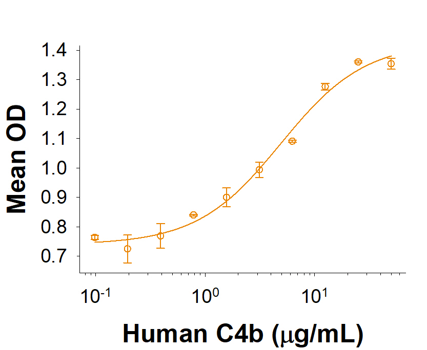 | Bio-activity : | Measured by its binding ability in a functional ELISA. When Recombinant Human CD46 Fc Chimera is immobilized at 5 μg/mL (100 μL/well), the concentration of Human C4b that produces 50% of the optimal binding response is 2-12 μg/mL. |