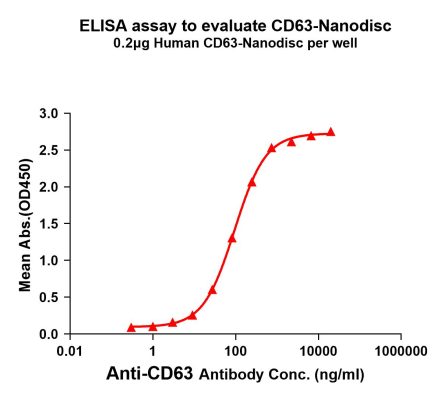 Bio-activity : | Elisa plates were pre-coated with Flag Tag CD63-Nanodisc (0.2μg/per well). Serial diluted anti-CD63 monoclonal antibody (DMC100425) solutions were added, washed, and incubated with secondary antibody before Elisa reading. From above data, the EC50 for anti-CD63 monoclonal antibody binding with CD63-Nanodisc is 94.22ng/ml. |