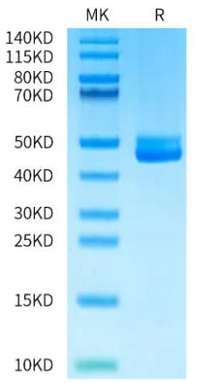 | Molecular Mass : | The protein has a predicted MW of 38.29 kDa. Due to glycosylation, the protein migrates to 43-53 kDa based on Bis-Tris PAGE result. |