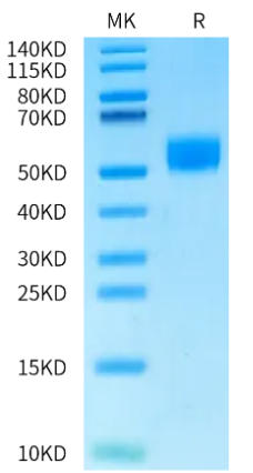 | Molecular Mass : | The protein has a predicted MW of 37.46 kDa. Due to glycosylation, the protein migrates to 50-65 kDa based on Bis-Tris PAGE result. |