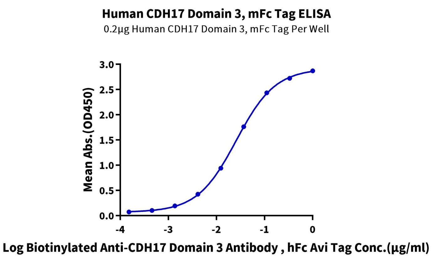 | Bio-activity : | Immobilized Human CDH17 Domain 3, mFc Tag at 2μg/ml (100μl/well) on the plate. Dose response curve for Biotinylated Anti-CDH17 Domain 3 Antibody, hFc Avi Tag with the EC50 of 25.9ng/ml determined by ELISA. |