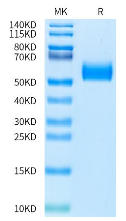 | Molecular Mass : | The protein has a predicted MW of 38.6 kDa. Due to glycosylation, the protein migrates to 50-65 kDa based on Tris-Bis PAGE result. |