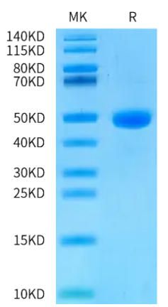 | Molecular Mass : | The protein has a predicted MW of 37.24 kDa. Due to glycosylation, the protein migrates to 45-55 kDa based on Bis-Tris PAGE result. |
