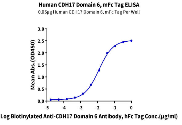 | Bio-activity : | Immobilized Human CDH17 Domain 6, mFc Tag at 0.5μg/ml (100μl/well) on the plate. Dose response curve for Biotinylated Anti-CDH17 Domain 6 Antibody, hFc Tag with the EC50 of 12.0ng/ml determined by ELISA. |