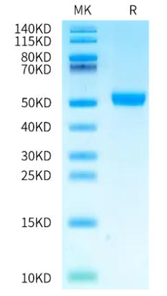 | Molecular Mass : | The protein has a predicted MW of 39.54 kDa. Due to glycosylation, the protein migrates to 48-58 kDa based on Bis-Tris PAGE result. |