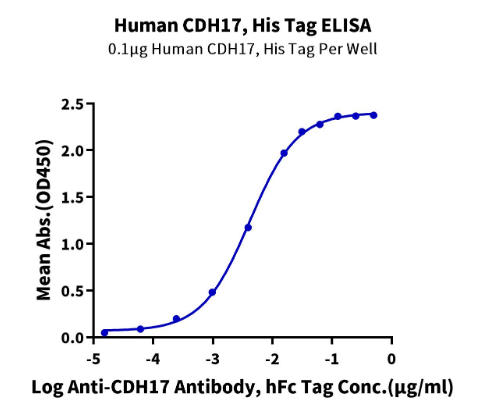 | Bio-activity : | Immobilized Human CDH17, His Tag at 1 μg/ml (100 μl/Well) on the plate. Dose response curve for Anti-CDH17 Antibody, hFc Tag with the EC50 of 4.1 ng/ml determined by ELISA. |