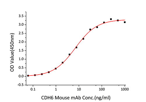 | Bio-activity : | Measured by its binding ability in a functional ELISA. Immobilized Human CDH6 at 1μg/mL (100 μL/well) can bind CDH6?Mouse?mAb with a linear range of 0.05-6.31 ng/mL. |
