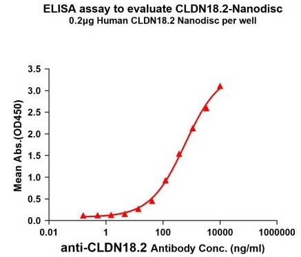 | Bio-activity : | Elisa plates were added with Flag Tag CLDN18.2-Nanodisc (0.2μg/per well) on an anti-Flag monoclonal antibody pre-coated (0.2μg/per well) plate. Serial diluted anti- CLDN18.2 monoclonal antibody solutions were added, washed, and incubated with secondary antibody before Elisa reading. From above data, the EC50 for anti- CLDN18.2 monoclonal antibody binding with CLDN18.2-Nanodisc is 593.6ng/ml. |