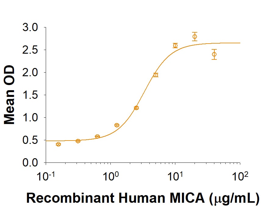 | Bio-activity : | Measured by its binding ability in a functional ELISA. When Recombinant Human CLEC12B Fc Chimera is immobilized at 4 µg/mL (100 µL/well), Recombinant Human MICA Fc Chimera binds with an ED50 of 1-6 μg/mL. |