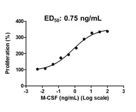 | Bio-activity : | Measure by its ability to induce proliferation in NFS-60 cells. The ED50 for this effect is < 1 ng/mL. The specific activity of recombinant human M-CSF is approximately >2.5 × 10⁸ IU/mg. |