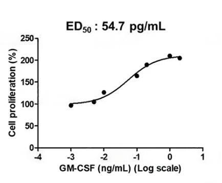 | Bio-activity : | Measure by its ability to induce TF-1 cells proliferation. The ED50 for this effect is < 80 pg/mL. The specific activity of recombinant human GM-CSF is approximately >1 × 10⁷ IU/mg. |