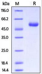 Molecular Mass : | This protein carries a mouse IgG2a Fc tag at the C-terminus, followed by an Avi tag (Avitag™).The protein has a calculated MW of 42.1 kDa. The protein migrates as 50-55 kDa under reducing (R) condition (SDS-PAGE) due to glycosylation. |