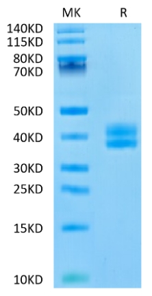 | Molecular Mass : | The protein has a calculated MW of 60.1 kDa. The protein migrates as 60-65 kDa under reducing (R) condition (SDS-PAGE) due to glycosylation. |