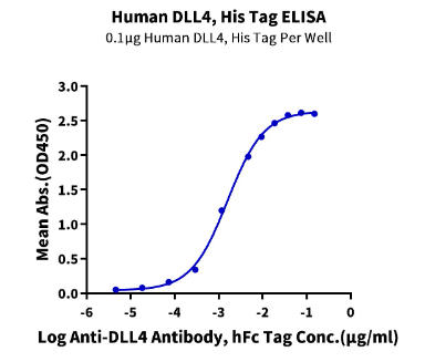 | Bio-activity : | Immobilized Human DLL4, His Tag at 1μg/ml (100μl/well) on the plate. Dose response curve for Anti-DLL4 Antibody, hFc Tag with the EC50 of 1.6ng/ml determined by ELISA. |