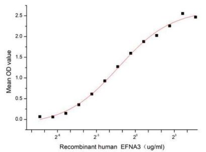 | Bio-activity : | Ephrin A3 (EFNA3) , also known as EFL2, EPLG3, LERK3, Ehk1-L, is a member of the Eph/ephrin tyrosine kinase family. EFNA3 is localized in cell membranes and was highly expressed in brain, skin, esophagus, skeletal muscle, spleen, thymus, prostate, testis, ovary, small intestine, peripheral blood leukocytes. EFNA3, like most genes in the ephrin family, plays a central role in embryonic development can associate with multiple signaling pathways involved in cell growth and tumor cell metastasis. Aberrant regulation of EFNA3 is associated with the occurrence and development of various types of cancer. Ephrin Type A Receptor 4 (EPHA4) is a receptor for members of the ephrin-A family. It can bind to EFNA3. Thus a functional binding ELISA assay was conducted to detect the interaction of recombinant human EFNA3 and recombinant human EPHA4. Briefly, EFNA3 was diluted serially in PBS with 0.01% BSA (pH 7.4). Duplicate samples of 100 μl were then transferred to EPHA4-coated microtiter wells and incubated for 1h at 37°C. Wells were washed with PBST and incubated for 1h with anti-EFNA3 pAb, then aspirated and washed 3 times. After incubation with HRP labelled secondary antibody for 1h at 37°C, wells were aspirated and washed 5 times. With the addition of substrate solution, wells were incubated 15-25 minutes at 37°C. Finally, add 50 µL stop solution to the wells and read at 450/630 nm immediately. The binding activity of recombinant human EFNA3 and recombinant human EPHA4 was shown, the EC50 for this effect is 0.4 ug/mL. |