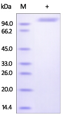 | Molecular Mass : | Have a calculated MW of 71.2 kDa. The predicted N-terminus is Leu 25. DTT-reduced Protein migrates as 110-115 kDa in SDS-PAGE due to glycosylation. |