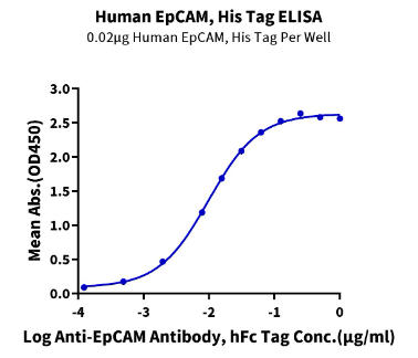 | Bio-activity : | Immobilized Human EpCAM, His Tag at 0.2μg/ml (100μl/well) on the plate. Dose response curve for Anti-EpCAM Antibody, hFc Tag with the EC50 of 9.8ng/ml determined by ELISA. |